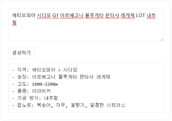 이전 글에서 OpenAI 가 원두 제품명만 하드 코딩해도 제법 정보를 설명해주는 것을 확인했습니다 !