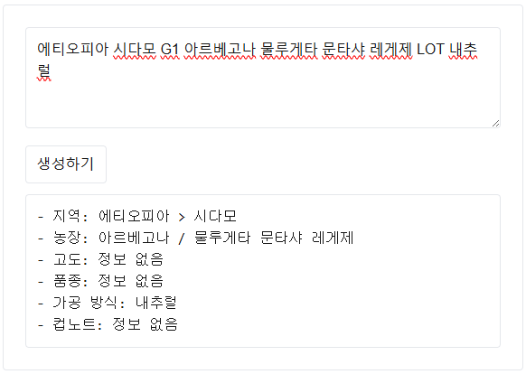 "입력으로 주어진 '원두 제품명'에 포함된 정보만 사용하고, 임의 추정 및 창작은 금지",