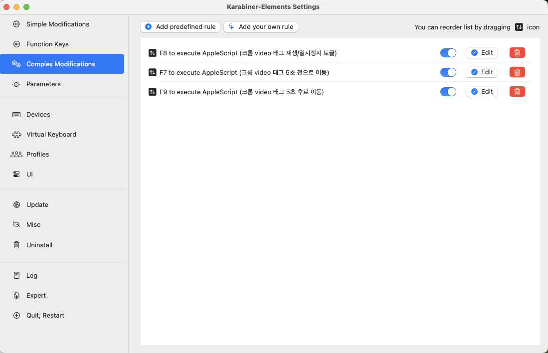 이후 좌측의 메뉴 목록 중 [Complex Modifications] 에서 [Add your own rule] 을 이용하면