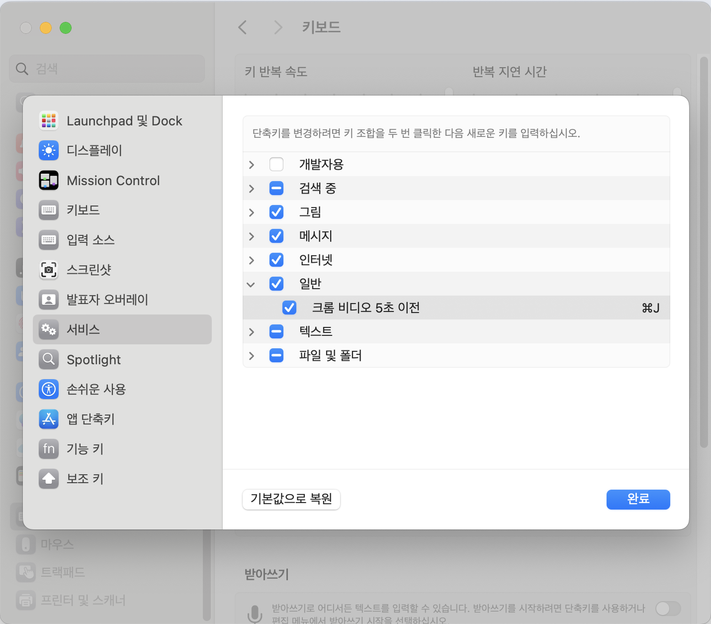 키보드 단축키에서 좌측에 서비스 메뉴로 들어가면,