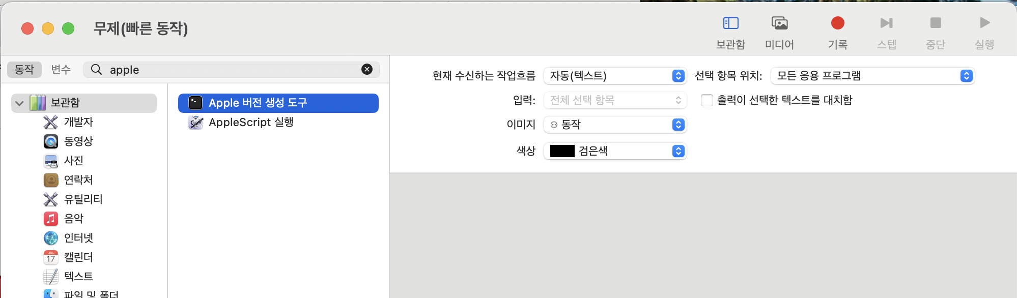 일반 그룹에 Automator 에서 저장한 빠른 동작이 등록이 되어있게 됩니다