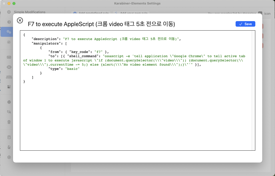"description": "F7 to execute AppleScript (크롬 video 태그 5초 전으로 이동)",